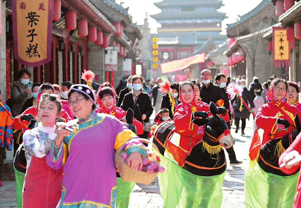 2月17日,忻州古城,民間文藝表演隊正在街頭巡演。春節(jié)期間,忻州古城舉辦“逛古城、品文化、識忻州”旅游文化活動,雄獅起舞、八音吹奏、秧歌表演等一系列富有當(dāng)?shù)靥厣拿耖g文藝活動精彩紛呈,吸引了眾多旅游者游覽觀賞,整個古城呈現(xiàn)出一派喜慶祥和的節(jié)日氣氛。