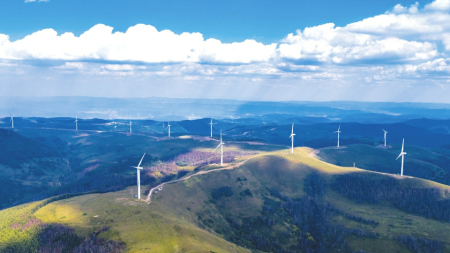 3.花坡景區(qū)聳立的風(fēng)電機組與綠草甸交相輝映,美不勝收。