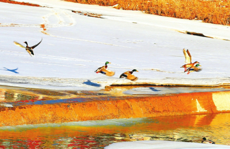 成群的綠頭鴨在方山縣北川河畔時而展翅飛翔,時而覓食戲水,為冬日增添了幾許靈動。
