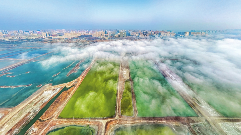 3月11日,因連日來天氣晴好,晝夜溫差大,運(yùn)城市中心城區(qū)和鹽池上空出現(xiàn)平流霧景觀,七彩的鹽池在霧氣下若隱若現(xiàn),形成一幅無與倫比的美麗畫卷。據(jù)了解,平流霧是沿海暖濕空氣水平流經(jīng)寒冷地面或水面時(shí),導(dǎo)致下部冷卻而形成的云霧。