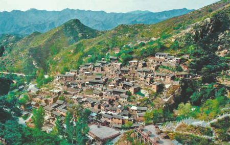 遠眺大汖古村,房屋依山而建鱗次櫛比。