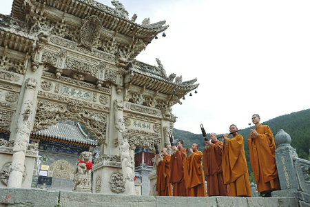 一次五臺(tái)山,五百年因緣。剛到龍泉寺108級(jí)臺(tái)階下,就聽到婉轉(zhuǎn)悠揚(yáng)又直入人心的樂(lè)曲聲從高處傳來(lái)。走到龍泉寺三寶之一的照壁抬眼向高望去,越過(guò)青石臺(tái)階,第二寶石牌坊下,一隊(duì)僧人正在演繹國(guó)家級(jí)非物質(zhì)文化遺產(chǎn)五臺(tái)山佛樂(lè)。