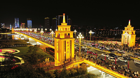 夜幕下新近改造的迎澤大橋宛如一條被紅色點亮的巨龍,橫臥在波光粼粼的汾河之上。金色的欄桿、飄動的五星紅旗、耀眼的中華燈裝扮出濃濃的節(jié)日氛圍,從四面八方趕來的人們漫步橋上,頻頻舉起手機拍照留念。
