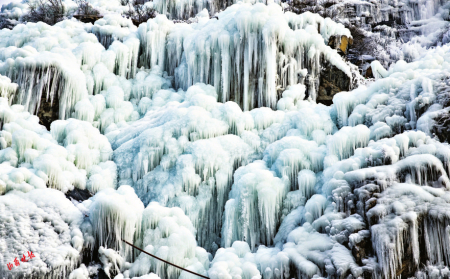 五老峰景區(qū)錦繡谷,工作人員借助天然溪流形成的冰掛加以人工造冰造型,按照生態(tài)環(huán)保和藝術(shù)創(chuàng)意要求,打造出長約1公里、單體高3米至10米的彩色冰掛,極具視覺沖擊力。一條條冰掛或垂于崖壁,或懸于樹枝,晶瑩剔透,壯觀雄渾。滿目的玉樹瓊花、銀峰玉柱形成一幅霧凇冰掛奇景,讓人仿佛置身于童話世界。