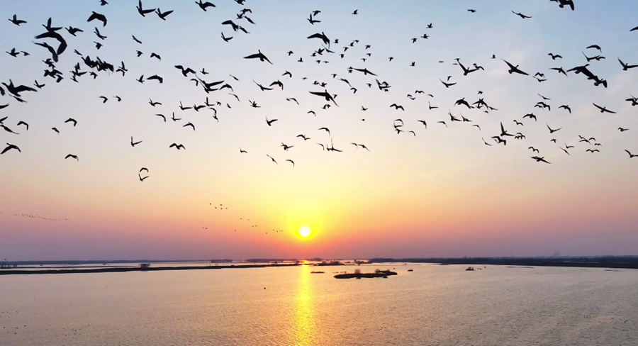 ?初春時(shí)分,在夕陽(yáng)余暉映照下,安徽省潁上縣秋家湖濕地被染上一層夢(mèng)幻般的色彩。放眼望去,成群飛鳥(niǎo)與漫天霞光融為一體,繪就出一幅壯美而靈動(dòng)的生態(tài)畫(huà)卷。(徐紅梅)