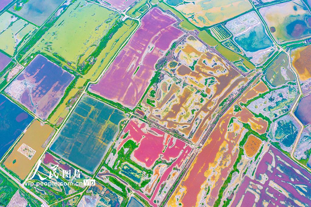 2025年9月2日,山西省運城鹽湖呈現(xiàn)出色彩斑斕的景象。