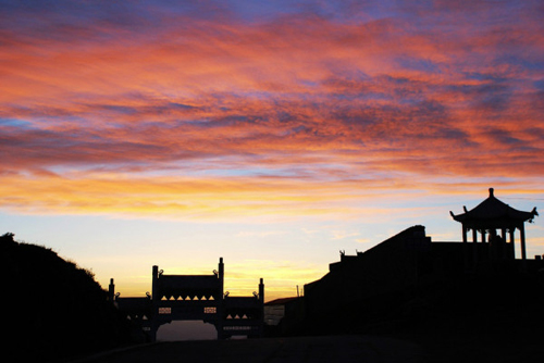 望海峰的盛景在于東觀日出。由于東面再無大山阻擋,所以人的目力可東眺非常遙遠(yuǎn)的地方。峰頂曾建有望海樓,專門為觀景而建??上昃靡褮?,1985年重建,為望海寺,內(nèi)供聰明文殊。有史籍記載日出之壯麗景象:“每當(dāng)蒸云寢壑之隙,爽氣澄秋之際,于日出扶桑之時(shí),可望紅日十倍于車輪,紅輪之下,隱隱水光閃爍,若波若鏡,瑰麗非凡。1977年8月,趙樸初先生登東臺(tái)觀日出后乘興填詞《五臺(tái)雜詠·調(diào)寄憶江南》,形象描繪了東臺(tái)日出之勝景:
