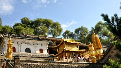 顯通寺的大雄寶殿為舉行佛事活動(dòng)主要場(chǎng)所,是顯通寺的第三重大殿,殿內(nèi)供著三尊佛像:中是釋迦牟尼佛,西是阿彌陀佛,東是藥師佛;兩旁有十八羅漢像背后有觀音、文殊、普賢三尊菩薩像。觀音殿殿內(nèi),中間供著觀音菩薩像,左右供著文殊和普賢菩薩像。大文殊殿,是顯通寺的第二重大殿。大文殊殿內(nèi),供著七尊文殊菩薩像:正中的為大智文殊;前面的五位,從左至右,依次為西臺(tái)獅子文殊,南臺(tái)智慧文殊,中臺(tái)孺者文殊,北臺(tái)無(wú)垢文殊,東臺(tái)聰明文殊;大智文殊后面是甘露文殊。文殊像前有護(hù)法神韋馱像,兩側(cè)有十八羅漢像。