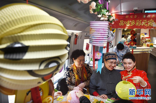 3月1日,在青島開往北京南的G184次列車上,青島高鐵餐飲公司的工作人員和旅客一起制作花燈。
