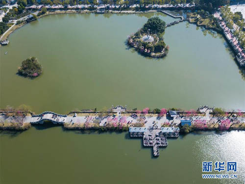 3月11日,游人在福建農(nóng)林大學(xué)校內(nèi)賞花(無人機(jī)拍攝)。
