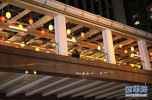 香港一過街天橋掛滿燈籠(1月23日攝)。 農(nóng)歷豬年臨近,香港街頭裝扮得流光溢彩,喜氣盈盈。 新華社記者 吳曉初 攝