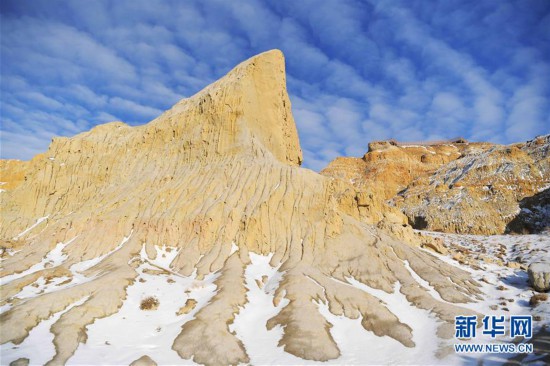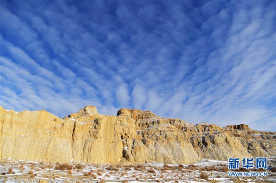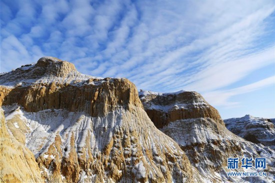 11月26日拍攝的新疆福海縣烏倫古湖海上魔鬼城景區(qū)美景。 福海縣烏倫古湖海上魔鬼城景區(qū)位于新疆阿勒泰地區(qū)福??h吉力湖東岸,有著獨特的雅丹地貌和水域景觀,是當?shù)刂穆糜蝿俚亍?新華社記者 沙達提 攝