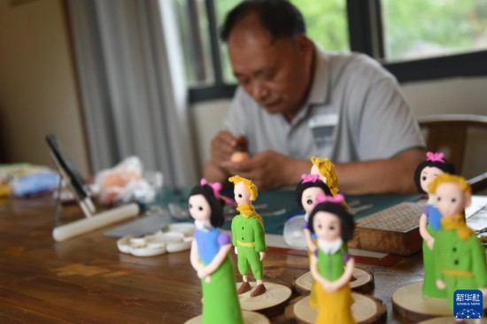 7月11日,江蘇省級(jí)非物質(zhì)文化遺產(chǎn)“阜寧面塑”傳承人周必良在穆溝古村進(jìn)行創(chuàng)作。