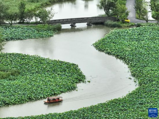 7月11日,游人乘船游覽穆溝古村(無(wú)人機(jī)照片)。