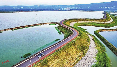 鴨子池位于運(yùn)城鹽湖以東,歷史上為保護(hù)鹽池而建,總面積4.7平方公里。近年來,隨著鴨子池水生態(tài)綜合提升工程的實(shí)施,這里逐漸形成集蓄水、滯洪、生態(tài)于一體的原生生態(tài)濕地系統(tǒng),處處水清草肥、景色宜人。來到池東新修的大壩觀景臺(tái),兩側(cè)水域煙波浩渺,將全線貫通的鴨子池環(huán)湖路與一堰之隔的七彩鹽湖環(huán)湖路相連,一幅天人合一的大美勝景令人心曠神怡。