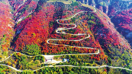 寒露過后,隨著秋風(fēng)一場連一場地吹過,馬泉溝的樹葉由綠變紅,迎來了它一年中的高光時(shí)刻。馬泉溝位于平陸縣三門鎮(zhèn)東部的小山村,距縣城50公里,因山路蜿蜒曲折,若驅(qū)車從縣城前往,需要近兩個(gè)小時(shí)。但當(dāng)你看到攝人心魄的美景時(shí),會(huì)覺得此行值得!馬泉溝村村域面積30000余畝,溝岔縱橫,山清水秀,森林覆蓋率達(dá)82.4%。萬畝黃櫨,是大自然給馬泉溝村的饋贈(zèng)。在100余種的野生灌木和保護(hù)林,主要以黃櫨灌木為主,其次還有白皮松、黃連木、山楓樹等七八種林木,在時(shí)間的浸染下,造就了馬泉溝一望無際的紅。