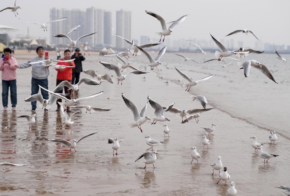 春日和暖,大批海鷗在河北省秦皇島市金夢(mèng)海灣浴場(chǎng)飛舞、覓食,吸引游客前來(lái)觀賞。