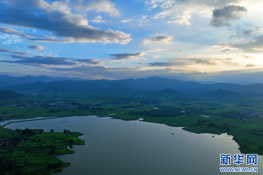 7月27日,河南省南陽市鎮(zhèn)平縣上空朝霞滿天,天空、云朵、群山、水面在霞光的映襯下,宛若一個巨大的調(diào)色盤,美如畫卷。新華網(wǎng)發(fā)(圖文/時君洋)