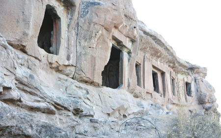 進(jìn)入寺院抬頭仰望,距現(xiàn)地表高約10米的山體上由北向南排列著九座石窟??傮w特征皆平面方形,窟頂上部外立面存有窟檐橡孔。沿山崖堆積的土丘登高看到,每窟面積約為2平方米,四壁垂直,頂部為平頂或略帶弧度。第一、三、五窟門(mén)楣雕有火焰紋裝飾,門(mén)楣內(nèi)雕飛天或花卉,門(mén)兩側(cè)設(shè)方形石柱或八棱束蓮柱。一至六窟平面呈長(zhǎng)方形,平頂,四壁平直;七至九窟呈長(zhǎng)方形,拱券頂;中間一孔入口兩側(cè)還刻有石雕小獸,造型生動(dòng)。9窟中除第8窟為未完工的窟室和第7窟推測(cè)為僧房窟外,余下的窟俱為佛殿窟??邇?nèi)三面石壁上都刻有佛像,設(shè)低壇。四壁三龕,每龕一佛二菩薩或一佛二弟子,造像面相豐潤(rùn)、頤頰飽滿(mǎn)。雖年久失修,風(fēng)化嚴(yán)重,但仍能從中領(lǐng)略幾分豪邁灑脫的大唐風(fēng)韻。三至六窟外壁存摩崖碑3通,均為螭首,碑文漫漶不清。據(jù)摩崖碑上“……歲次丁丑七月辛酉朔十五日乙亥建立”字跡記載,雕造于唐儀鳳二年(公元677年)。