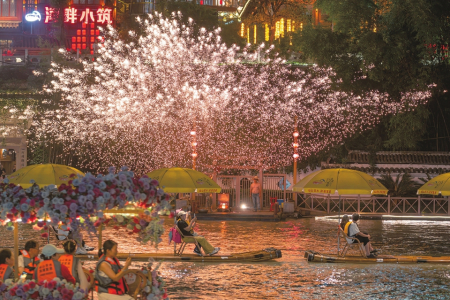 7月9日,游客乘坐“龍游貢水”竹筏在貢水河上觀賞打鐵花表演。位于湖北省恩施土家族苗族自治州的宣恩縣城是一座“景城一體·主客共享”的國(guó)家4A級(jí)景區(qū)。近年來(lái),當(dāng)?shù)夭粩嗤脐惓鲂碌摹褒堄呜曀敝穹?、烏篷船等體驗(yàn)和觀賞項(xiàng)目,讓游客在璀璨燈火中沉浸式感受山區(qū)小城的夜色魅力。