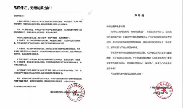 目前,還有多家餐飲公司回應(yīng)。9月7日,廣州多滿分食品有限公司發(fā)聲明稱(chēng),學(xué)生餐均是就餐當(dāng)天上午在央廚新鮮現(xiàn)場(chǎng)制作完成的。