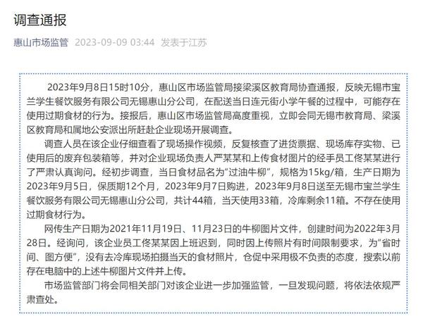9月9日,無(wú)錫市惠山區(qū)市場(chǎng)監(jiān)管局發(fā)布調(diào)查通報(bào)稱(chēng),不存在使用過(guò)期食材行為,網(wǎng)傳過(guò)期照片為員工圖方便搜索以前存在電腦中的牛柳圖片文件并上傳。