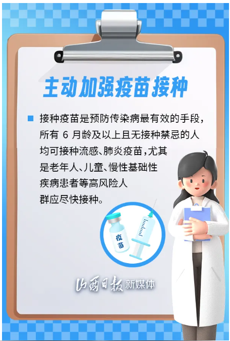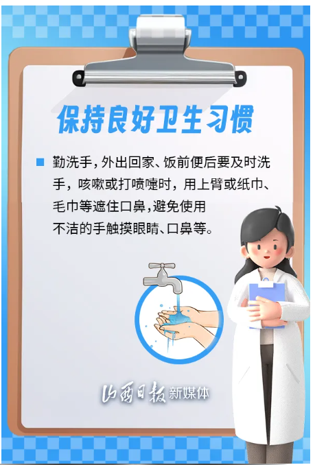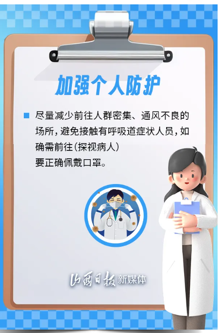 為保護(hù)公眾身體健康,有效應(yīng)對傳染病疫情,山西省衛(wèi)健委、省疾控局溫馨提示,建議公眾加強(qiáng)個(gè)人防護(hù),科學(xué)佩戴口罩,保持良好衛(wèi)生習(xí)慣,健康安全度過這個(gè)冬季。