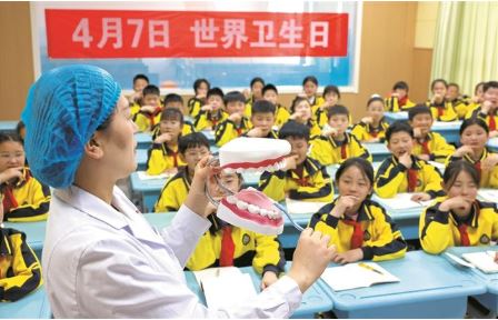 4月7日,在山東省棗莊市市中區(qū)紅旗小學(xué),醫(yī)務(wù)人員為學(xué)生講解保護(hù)牙齒的方法。