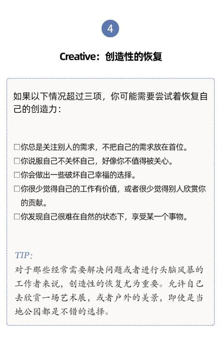 真正的休息,能夠幫助你從受外部刺激影響轉(zhuǎn)向調(diào)整自己的身體、思想和感受。當你選擇了適合自己的休息方式,集中注意力,就會和自己聯(lián)系起來,回到當下。