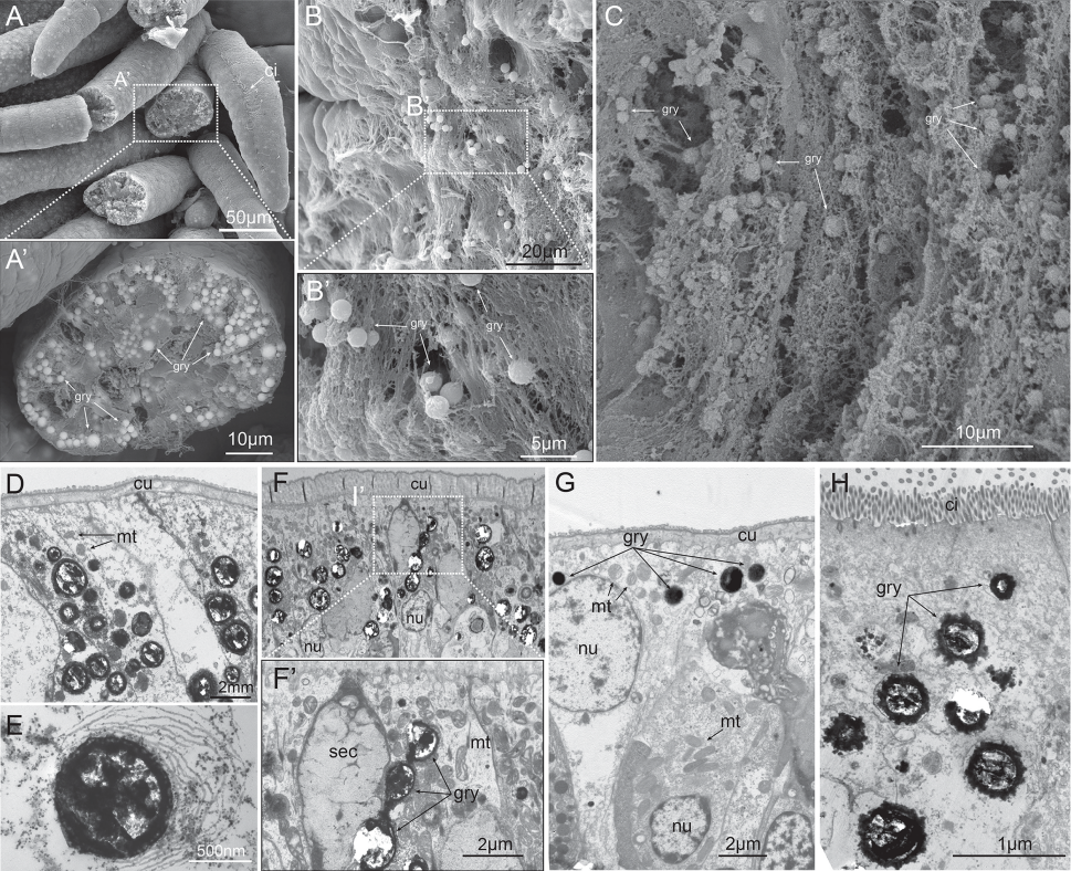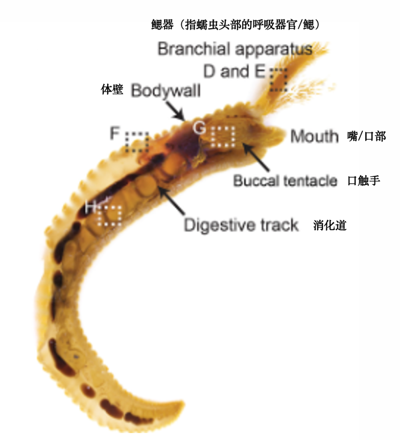 通過顯微鏡觀察,科學(xué)家發(fā)現(xiàn)蠕蟲的上皮細胞中充滿了直徑0.77-1.29微米的黃色顆粒。這些顆粒不僅存在于體表,還分布在鰓、口觸手和消化道中——所有與海水直接接觸的部位。
