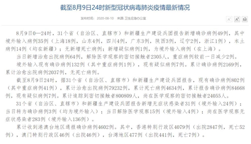 情況顯示,截至8月9日24時(shí),據(jù)31個(gè)?。ㄗ灾螀^(qū)、直轄市)和新疆生產(chǎn)建設(shè)兵團(tuán)報(bào)告,現(xiàn)有確診病例802例(其中重癥病例41例),累計(jì)治愈出院病例79232例,累計(jì)死亡病例4634例,累計(jì)報(bào)告確診病例84668例,現(xiàn)有疑似病例7例。累計(jì)追蹤到密切接觸者800809人,尚在醫(yī)學(xué)觀察的密切接觸者24055人。