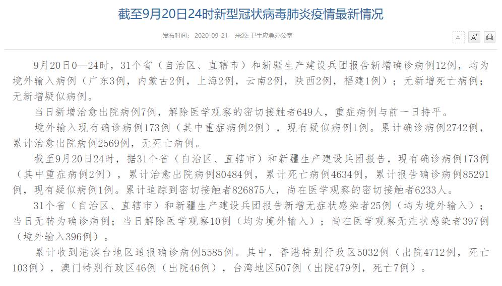 人民網(wǎng)北京9月21日電(董童)國家衛(wèi)生健康委于今日在官網(wǎng)發(fā)布的《截至9月20日24時新型冠狀病毒肺炎疫情最新情況》(以下簡稱“情況”)提出,9月20日0—24時,31個?。ㄗ灾螀^(qū)、直轄市)和新疆生產(chǎn)建設兵團報告新增確診病例12例,均為境外輸入病例(廣東3例,內(nèi)蒙古2例,上海2例,云南2例,陜西2例,福建1例);無新增死亡病例;無新增疑似病例。當日新增治愈出院病例7例,解除醫(yī)學觀察的密切接觸者649人,重癥病例與前一日持平。