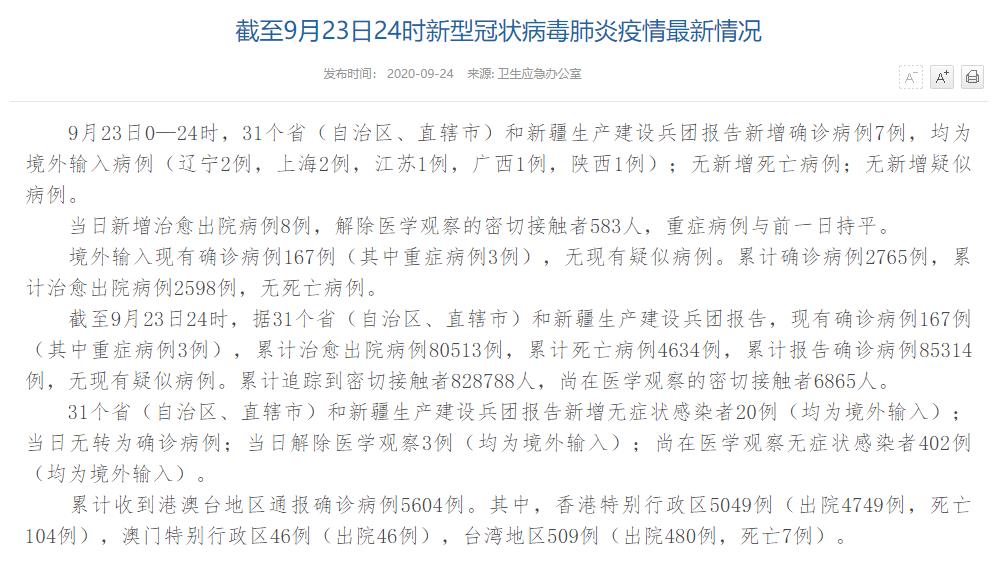 截至9月23日24時,據(jù)31個省(自治區(qū)、直轄市)和新疆生產(chǎn)建設(shè)兵團報告,現(xiàn)有確診病例167例(其中重癥病例3例),累計治愈出院病例80513例,累計死亡病例4634例,累計報告確診病例85314例,無現(xiàn)有疑似病例。累計追蹤到密切接觸者828788人,尚在醫(yī)學(xué)觀察的密切接觸者6865人。