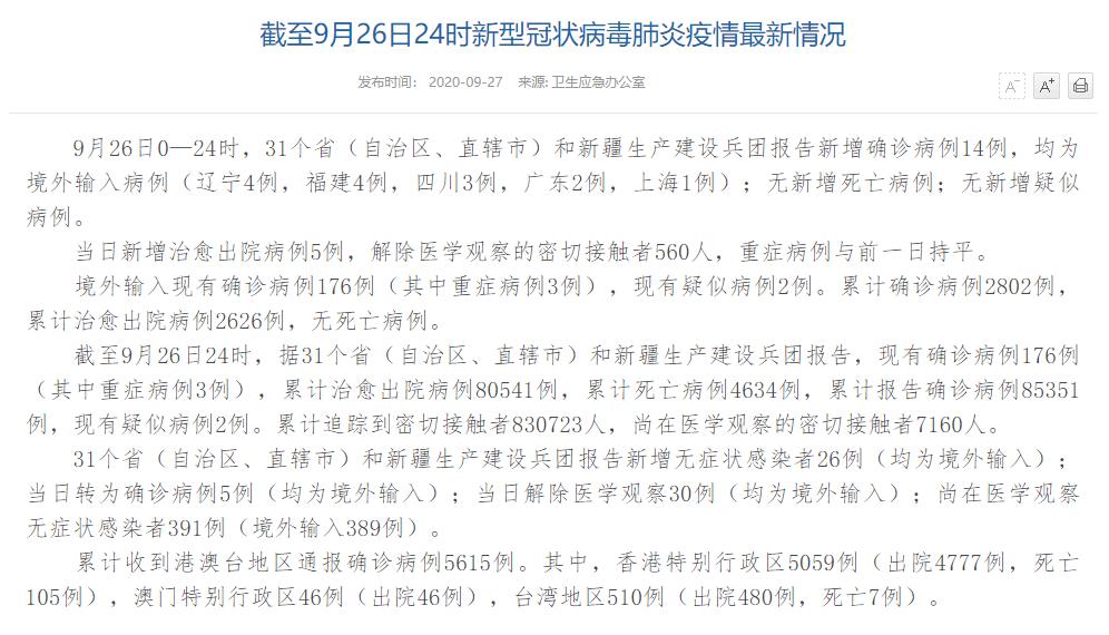 人民網(wǎng)北京9月27日電(董童)國家衛(wèi)生健康委于今日在官網(wǎng)發(fā)布的《截至9月26日24時新型冠狀病毒肺炎疫情最新情況》(以下簡稱“情況”)提出,9月26日0—24時,31個?。ㄗ灾螀^(qū)、直轄市)和新疆生產(chǎn)建設(shè)兵團報告新增確診病例14例,均為境外輸入病例(遼寧4例,福建4例,四川3例,廣東2例,上海1例);無新增死亡病例;無新增疑似病例。當(dāng)日新增治愈出院病例5例,解除醫(yī)學(xué)觀察的密切接觸者560人,重癥病例與前一日持平。