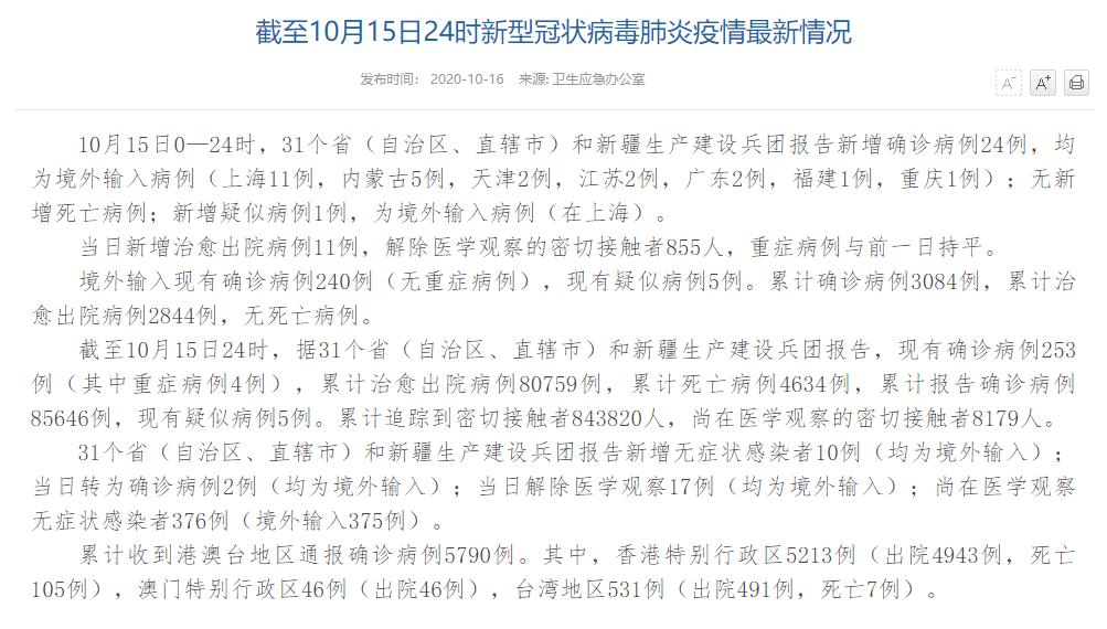 國家衛(wèi)健委:10月15日新增確診病例24例 均為境外輸入病例