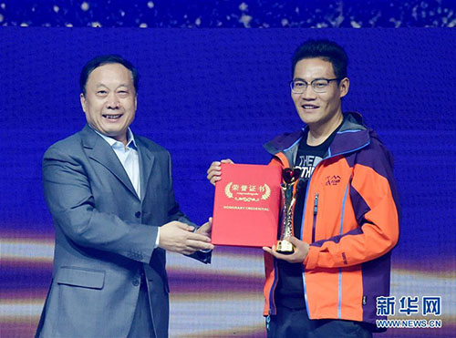 1月18日,“環(huán)保衛(wèi)士”次仁旦達(dá)(右)上臺(tái)領(lǐng)獎(jiǎng)。 當(dāng)日,新華社主辦的“中國(guó)網(wǎng)事·感動(dòng)2018”年度頒獎(jiǎng)典禮在中國(guó)傳媒大學(xué)舉行,10位“草根”成為舞臺(tái)上最閃亮的明星。新華社記者 李賀 攝