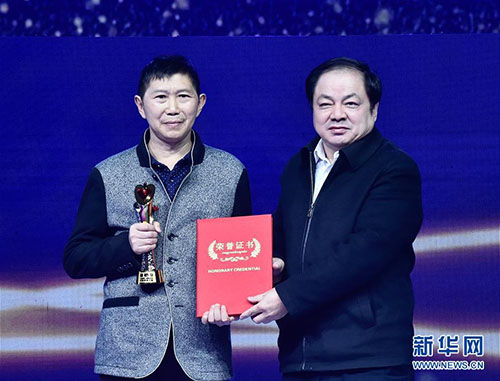 1月18日,“粉筆畫老師”張舉文(左)上臺(tái)領(lǐng)獎(jiǎng)。當(dāng)日,新華社主辦的“中國(guó)網(wǎng)事·感動(dòng)2018”年度頒獎(jiǎng)典禮在中國(guó)傳媒大學(xué)舉行,10位“草根”成為舞臺(tái)上最閃亮的明星。新華社記者 李賀 攝