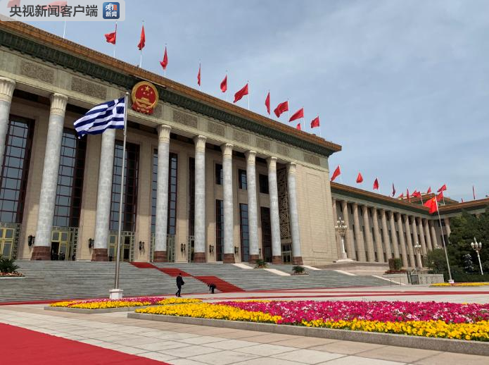 △希臘國(guó)旗在人民大會(huì)堂東門外廣場(chǎng)升起,歡迎希臘總統(tǒng)的儀式即將開始。(央視記者段德文拍攝)