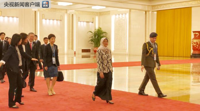△前來(lái)與習(xí)近平會(huì)面的新加坡總統(tǒng)哈莉瑪。(央視記者許永松拍攝)