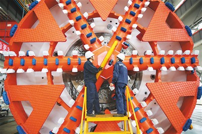 今年以來(lái),濟(jì)南重工集團(tuán)有限公司打造以軌道交通裝備產(chǎn)業(yè)為核心的智能制造與高端裝備產(chǎn)業(yè)園,重點(diǎn)發(fā)展全斷面隧道掘進(jìn)機(jī)、隧道掘進(jìn)專(zhuān)用裝備、裝配式建材生產(chǎn)線(xiàn)等產(chǎn)品領(lǐng)域,老國(guó)企煥發(fā)出勃勃生機(jī)。圖為工人在查看即將完工的盾構(gòu)機(jī)刀盤(pán)。
