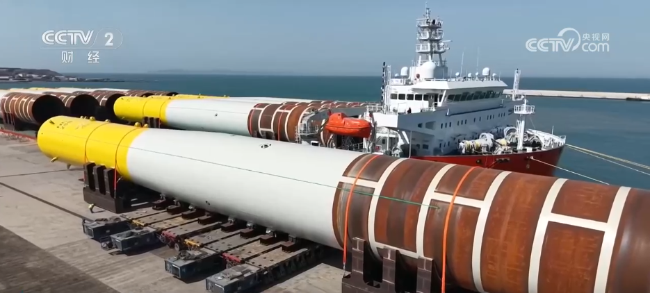 在山東蓬萊港的一處碼頭里,一根根長達(dá)100多米、重約2000噸的大型海上風(fēng)電單樁正在被工作人員運(yùn)輸?shù)匠隹诖吧?。這批風(fēng)電單樁將歷經(jīng)45天的海運(yùn)抵達(dá)歐洲,用于海上風(fēng)電場的建造。