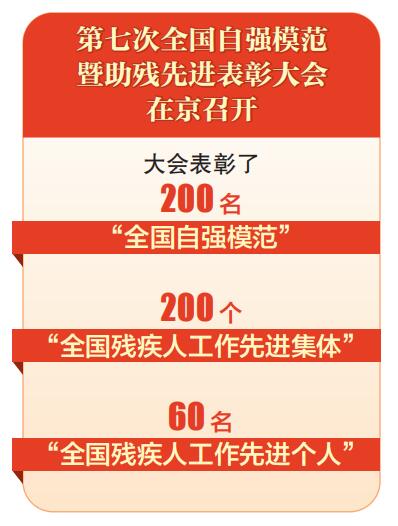 第七次全國自強(qiáng)模范暨助殘先進(jìn)表彰大會(huì)16日在北京人民大會(huì)堂召開。200名全國自強(qiáng)模范、200個(gè)全國殘疾人工作先進(jìn)集體和60名全國殘疾人工作先進(jìn)個(gè)人受到表彰。