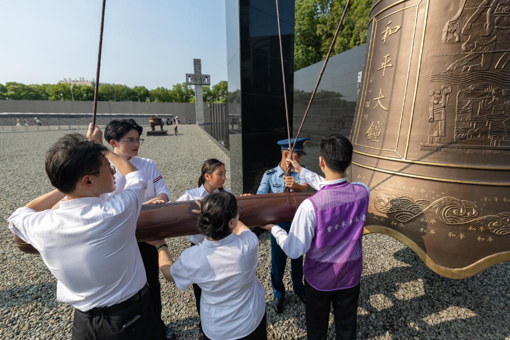 7月7日,各界人士代表在“紀(jì)念全民族抗戰(zhàn)爆發(fā)88周年”儀式現(xiàn)場撞響和平大鐘。新華社發(fā)(胡瀟攝)