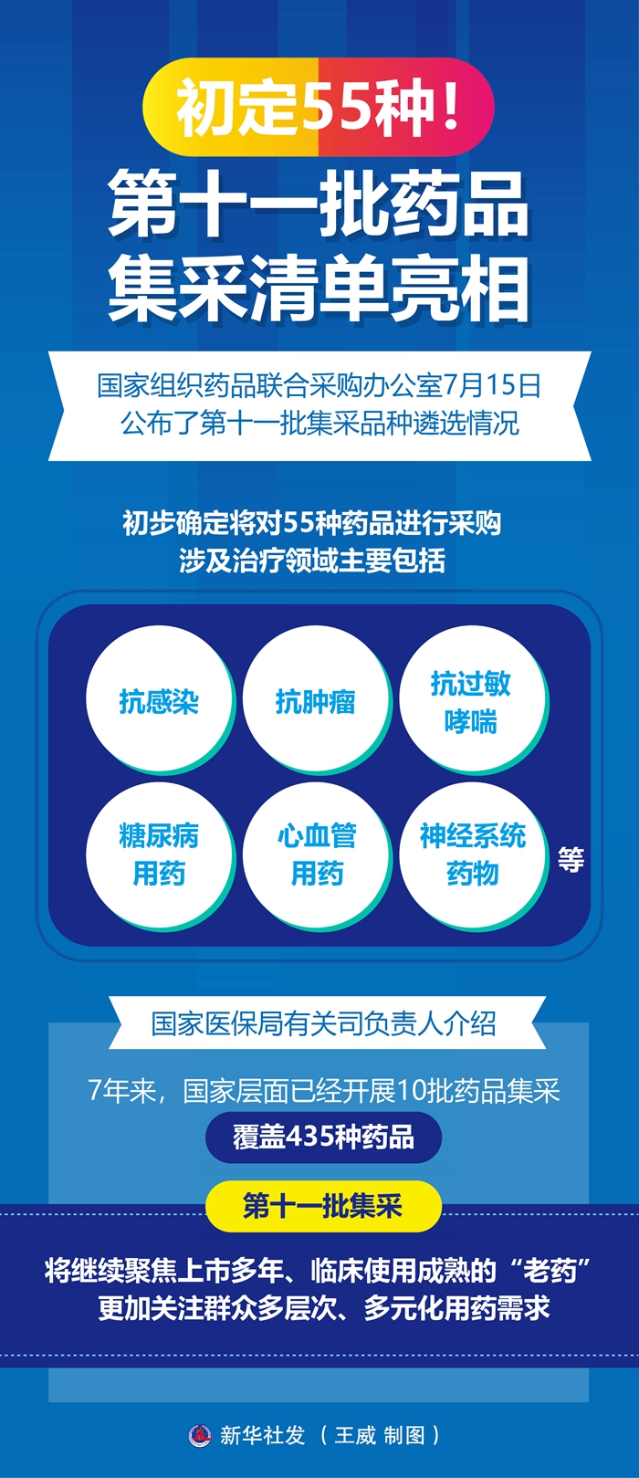 “新藥不集采、集采非新藥。”國家醫(yī)保局有關(guān)司負(fù)責(zé)人介紹,7年來,國家層面已經(jīng)開展10批藥品集采,覆蓋435種藥品,第十一批集采將繼續(xù)聚焦上市多年、臨床使用成熟的“老藥”,更加關(guān)注群眾多層次、多元化用藥需求。