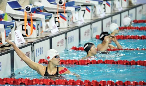 4 月16 日,在太原進行的2018 年全國游泳冠軍賽暨亞運會選拔賽女子100 米仰泳預(yù)賽中,浙江隊選手傅園慧以1 分00 秒83 的成績晉級決賽。圖為傅園慧(下)在賽后查看比賽成績。
