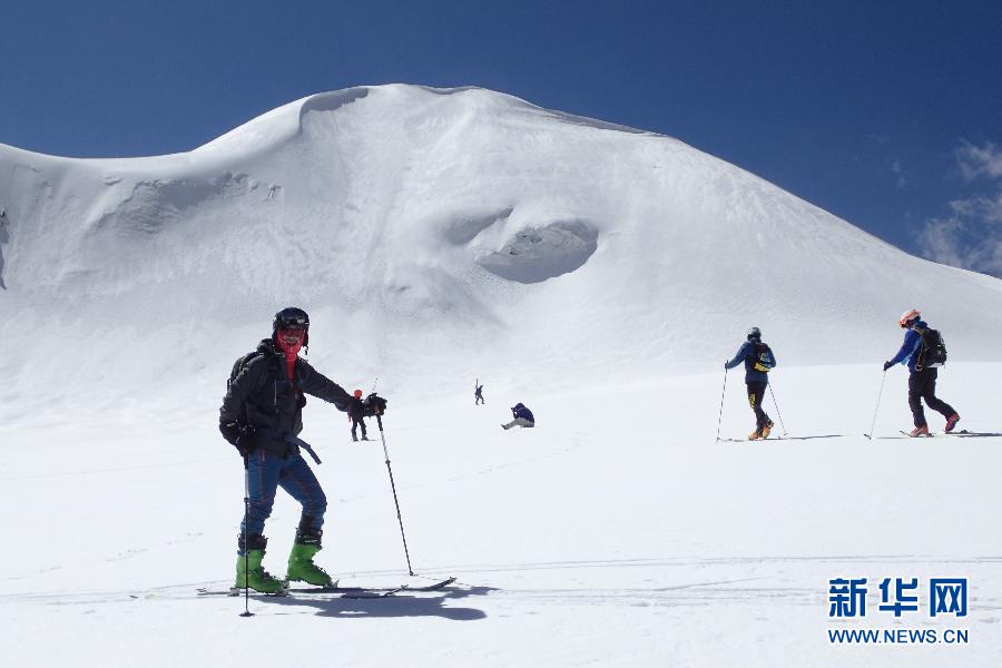 ↑記者第一次見到劉百靈是在第十六屆西藏登山大會滑雪登山項目的營地——洛堆峰雪線處,海拔5600米。劉百靈膚色黑得發(fā)亮,與身邊長年從事高山訓練的藏族教練無異。但細問起來,他說自己生在湖南,現(xiàn)居杭州,是地道的南方人。 因為對戶外運動尤其是對滑雪的執(zhí)著,劉百靈的膚色變了,過起了旁人眼中的另一種人生,也成了“異類”。但他卻感謝自己成了“異類”。這是10月4日,滑雪愛好者、“體育旅游”探索者劉百靈(左)在位于西藏自治區(qū)當雄縣羊八井鎮(zhèn)的洛堆峰雪坡上練習,此處海拔約5700米。遠處的山峰是海拔7048米的窮母崗日峰。 新華社發(fā)
