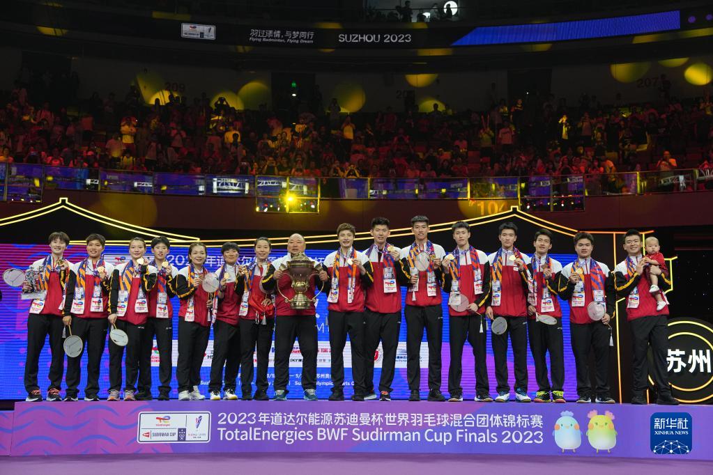 5月21日,2023年蘇迪曼杯世界羽毛球混合團體錦標賽頒獎儀式在江蘇省蘇州市舉行。中國隊在決賽中以3比0戰(zhàn)勝韓國隊,奪得冠軍。圖為中國隊在頒獎儀式上慶祝。新華社記者 杜宇 攝