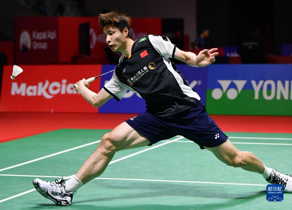 6月13日,石宇奇在雅加達舉行的2023年印度尼西亞羽毛球公開賽男單比賽中回球。新華社記者 徐欽 攝