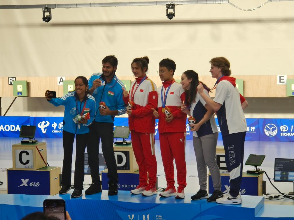 當天,射擊賽場的頒獎儀式現(xiàn)場變成了全場一起慶生的歡樂景象。在10米氣步槍混合團體項目獲得銀牌的印度姑娘瓦拉里萬站在領獎臺上,在“生日快樂”的祝福聲中,伴著現(xiàn)場觀眾的掌聲,與一同參加頒獎儀式的中國、美國選手們拍照留念。