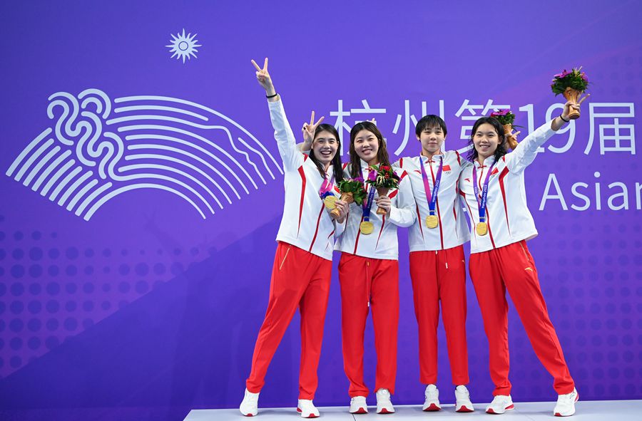 9月24日,女子4x100米自由泳接力決賽,由楊?,u、程玉潔、吳卿風(fēng)和張雨霏組成的中國隊(duì)優(yōu)勢(shì)明顯,最終以3分33秒96破賽會(huì)紀(jì)錄的成績奪得冠軍。